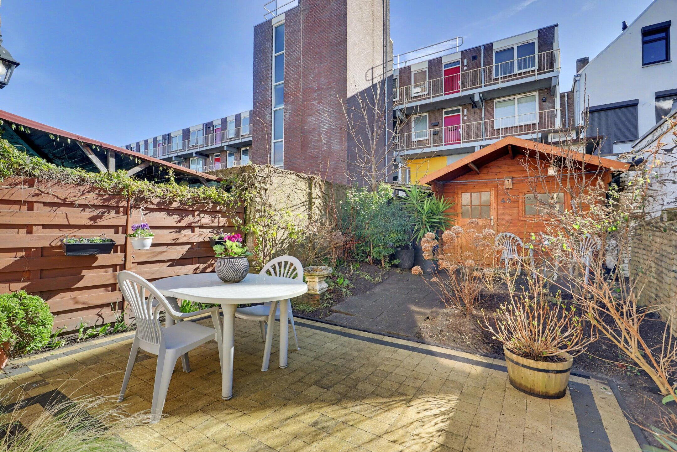 De achtertuin is opvallend zonnig door de ligging op het zuid-oosten en door de diepte van zo'n 10 meter. Een royale blokhut is de ideale berging en daar aan vast zit ook nog een afdak waarmee de poort naar de brandgang prima bereikbaar is.