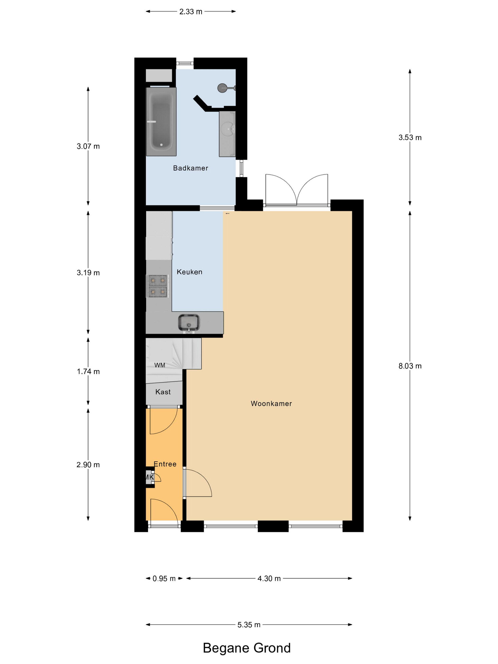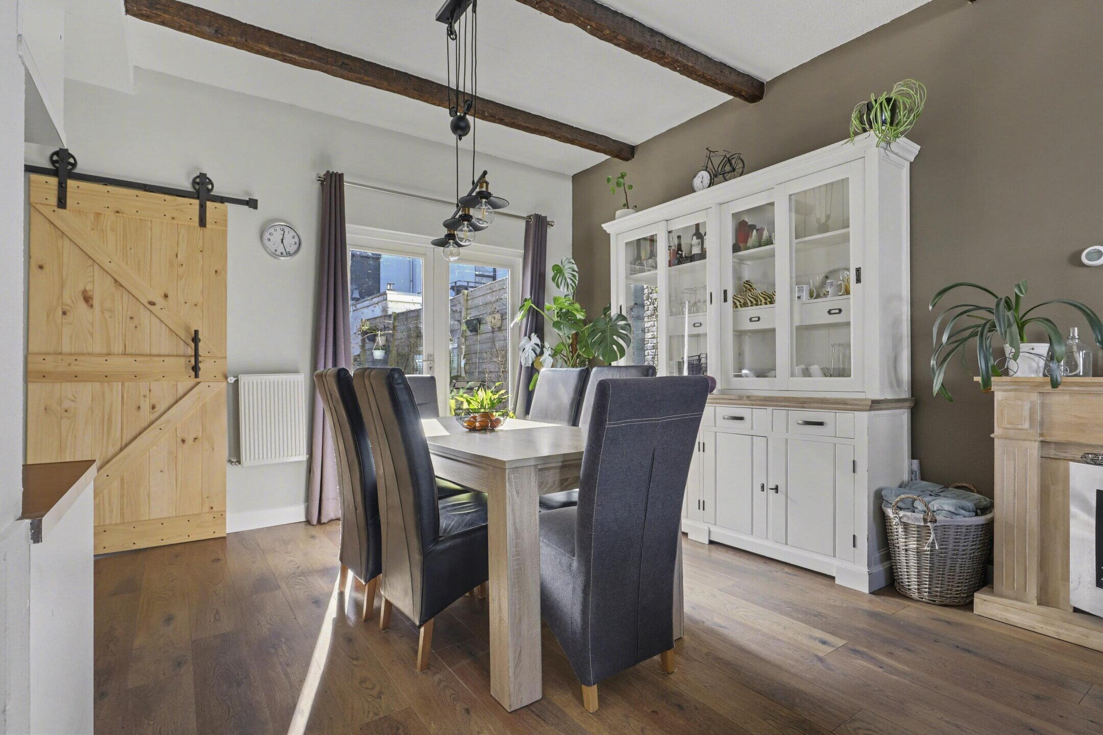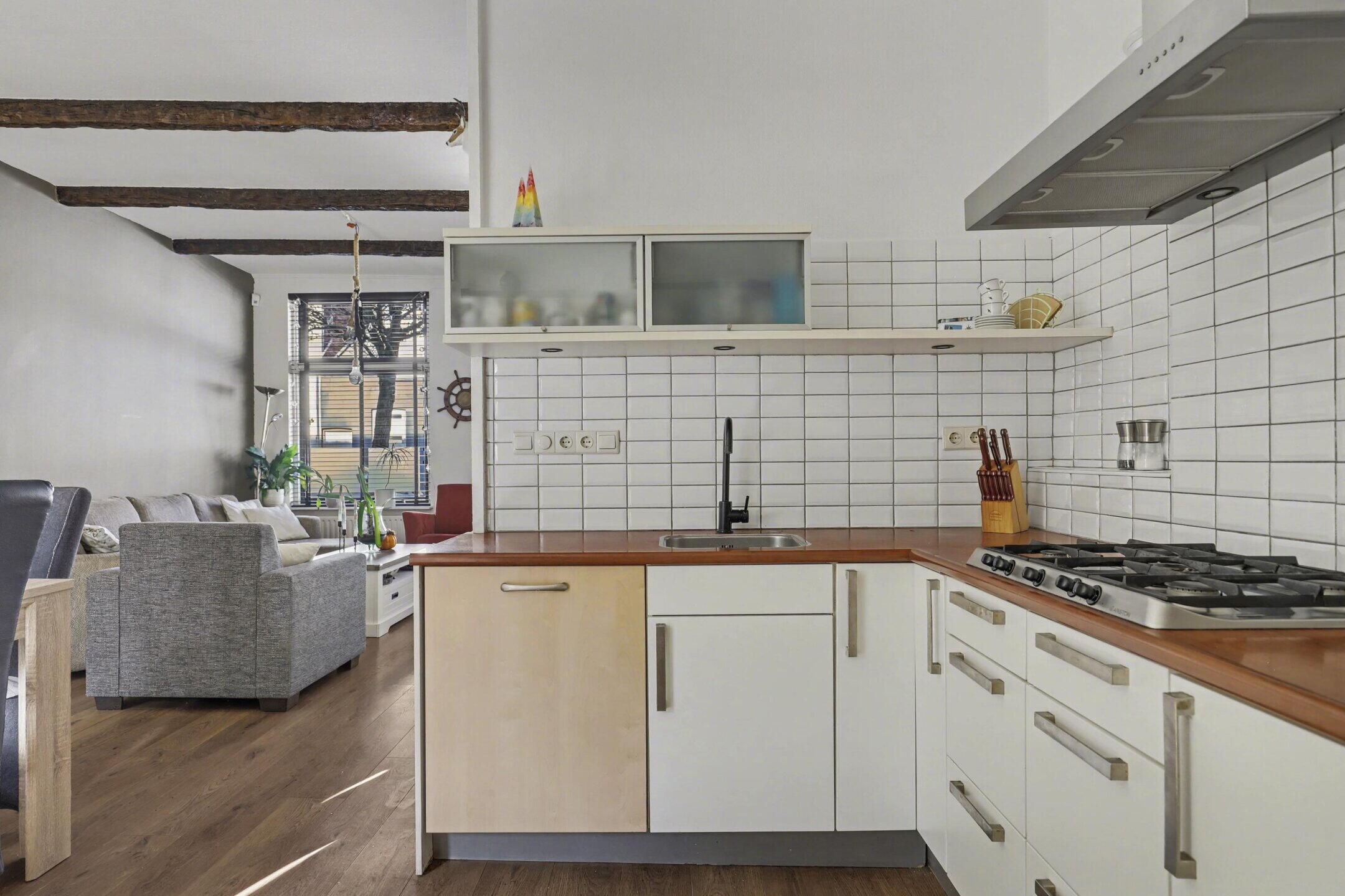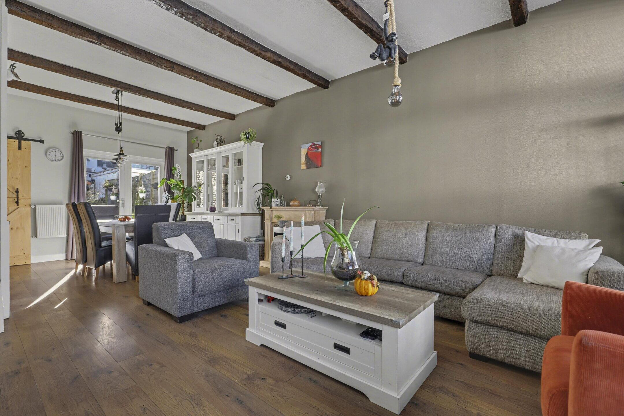 Begane grond: entree met een keurige voordeur en een gang met meterkast en een trapkast; ruim 8 meter diepe, heerlijk lichte woonkamer met hoge plafonds met sierbalkjes. Ideale verbinding met de tuin door dubbele tuindeuren.