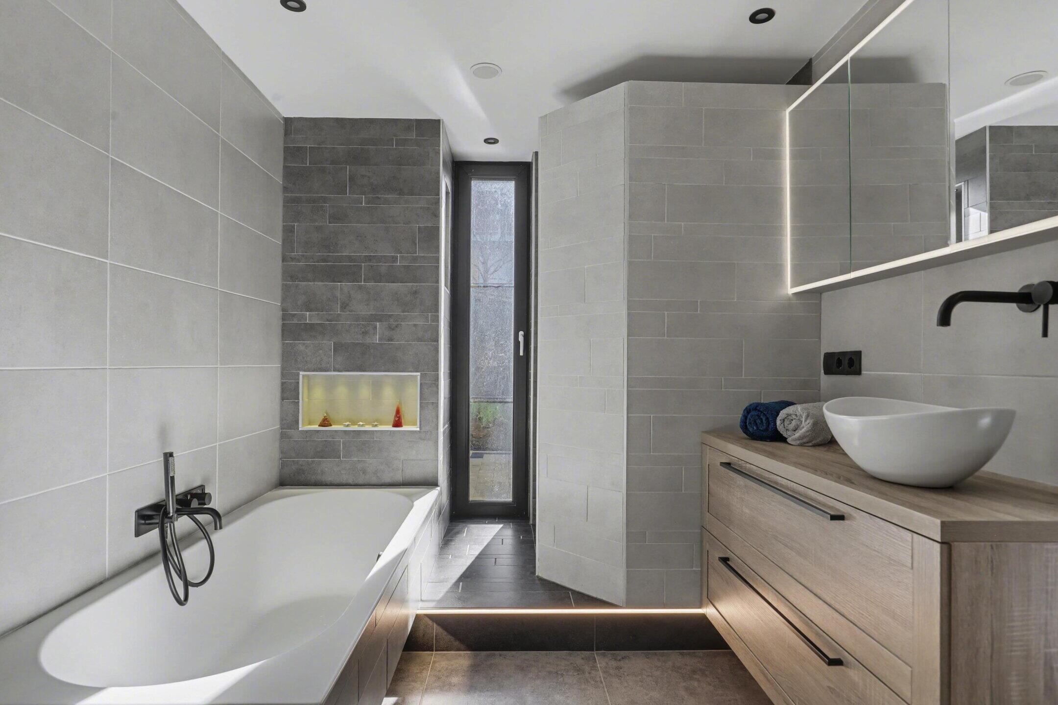 - Ligbad, toilet, wastafelmeubel, inloopdouche